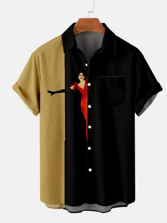 Description:This eye-catching shirt features a bold split-color design, with a stylish tan on one side...