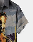 A contemporary men's short-sleeve button-down shirt featuring a sharp black and white graphic print. The full-coverage pattern is composed of repeating abstract, geometric figures and stylized faces created using thin, precise lines. The design has a minimalist, almost Cubist or continuous line art aesthetic. This shirt has a Camp Collar (or Cuban collar) and a relaxed fit, making it a sophisticated, artistic statement piece for casual urban wear or creative events."