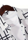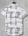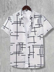 A sharp men's short-sleeve button-down shirt featuring a minimalist, geometric graphic print. The design consists of thin, bold black lines on a crisp white background, creating an abstract pattern of overlapping horizontal and vertical strokes, giving the look of a segmented, modern grid or map. This shirt has a classic collar, a single chest pocket, and a comfortable, relaxed fit, making it a stylish choice for casual wear, music festivals, or smart-casual outings."