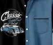 This bold, retro-inspired shirt features a unique split-color design with black on one side and blue on the other. Adorned with a classic vintage car graphic and the words “Classic SuperFast,” this shirt pays tribute to the timeless appeal of classic cars. Crafted from a blend of Lycra, it offers a comfortable, stretchy fit, making it perfect for both casual wear and car-themed events.