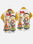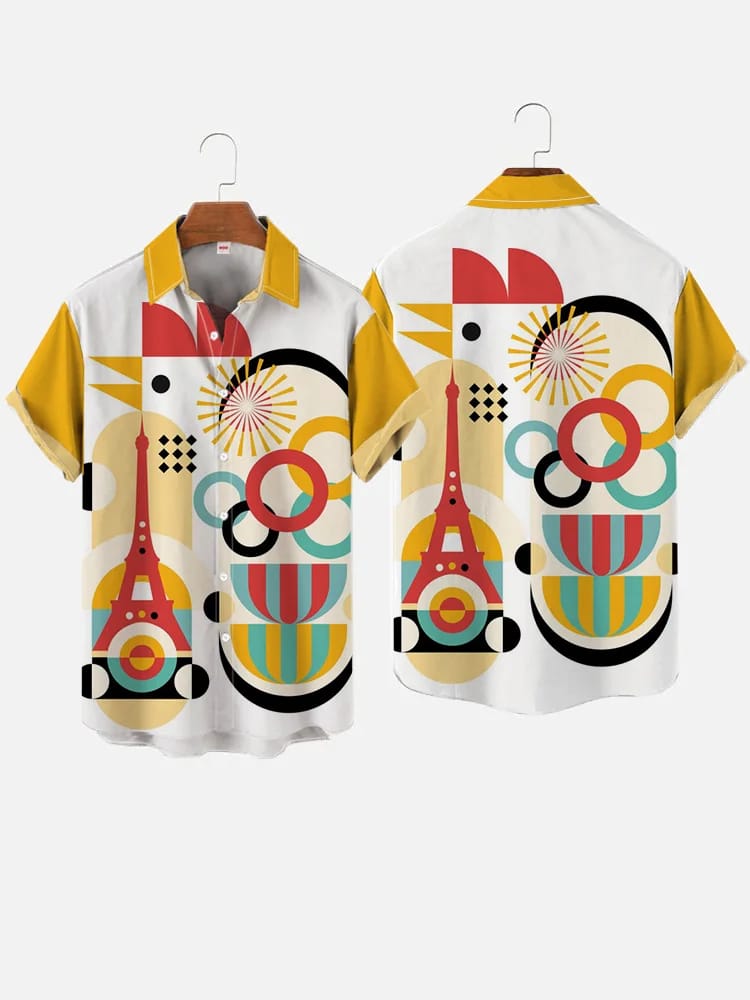 "A stylish men's short-sleeve button-down shirt featuring a dramatic horizontal gradient print. The top portion transitions smoothly from a clean white to a bright mustard yellow/gold, which is segmented by distressed, horizontal brushstrokes of brown and dark orange, resembling a painted sunset or arid landscape. The bottom portion finishes in a deep navy or indigo blue. This relaxed-fit shirt is a bold, artistic statement piece, perfect for evening casual wear or resort events."