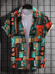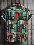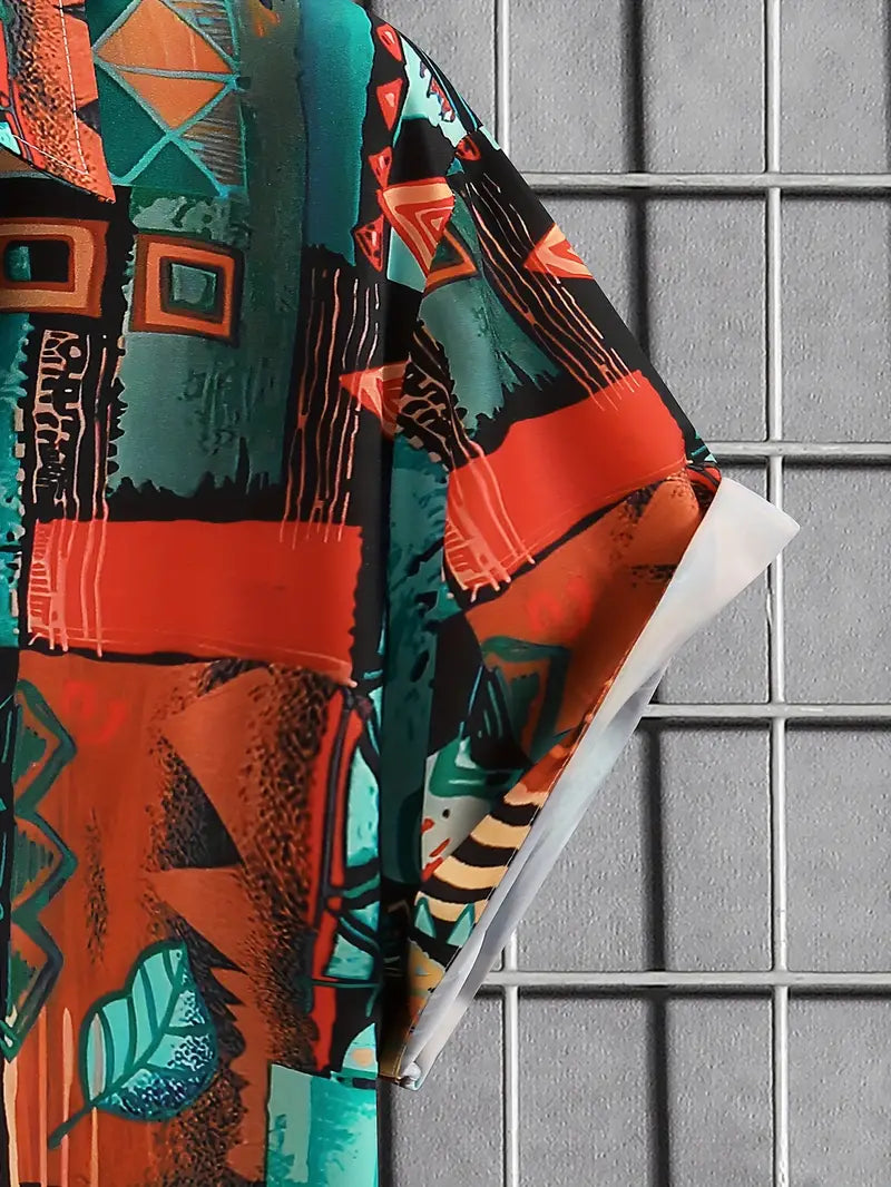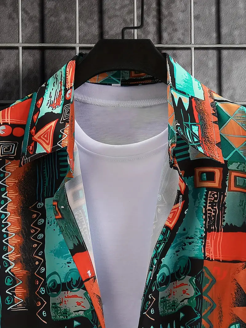 "A highly graphic men's short-sleeve button-down shirt featuring a mesmerizing black-and-white abstract print. The full-coverage design is composed of repeating stylized human faces, geometric shapes, and fragmented lines, giving it a modern, Pop Art or abstract expressionist feel. The contrast is sharp and eye-catching. With a relaxed fit and a classic collar, this shirt is a powerful statement piece perfect for casual urban wear, creative events, or parties."