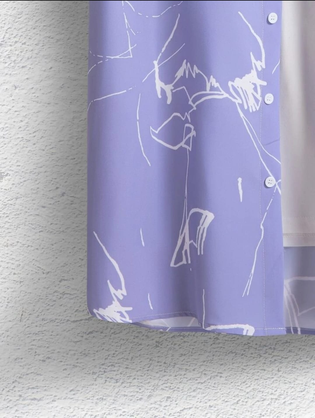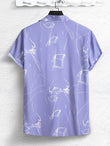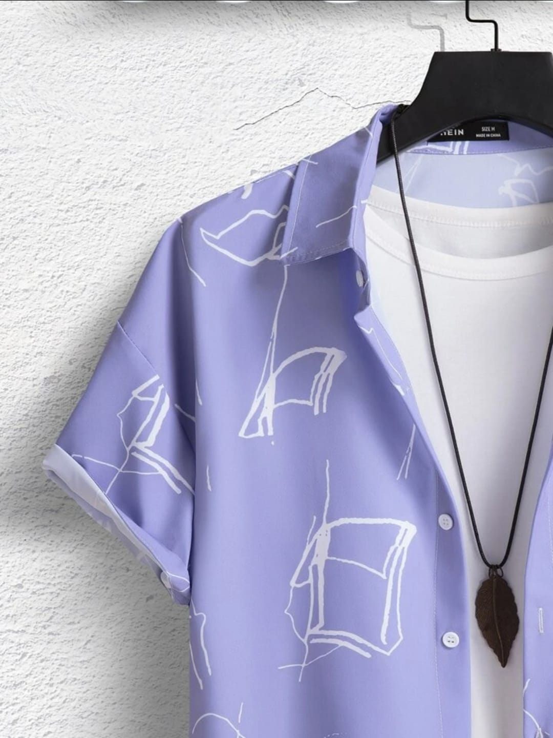 "A fashionable men's short-sleeve button-down shirt featuring a clean, light purple or lilac/lavender color base. The print consists of an abstract white line art design, resembling free-flowing scribbles, sketches, or fragmented shapes. The shirt has a Camp Collar (or Cuban collar) and a relaxed fit, giving it a modern, artsy, and laid-back aesthetic. The soft color and relaxed style make it perfect for summer, vacation, or casual streetwear."