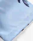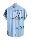 A breezy men's short-sleeve button-down shirt featuring a classic tropical landscape print. The fabric is a serene pale or baby blue color, patterned with black sketch outlines of elements like palm trees, tropical islands, mountains, flying birds, and small sailboats. The minimalist, line-art approach to the print gives it a modern twist on the traditional Hawaiian shirt. It has a relaxed fit and is ideal for beachwear, summer vacations, or cruise attire."