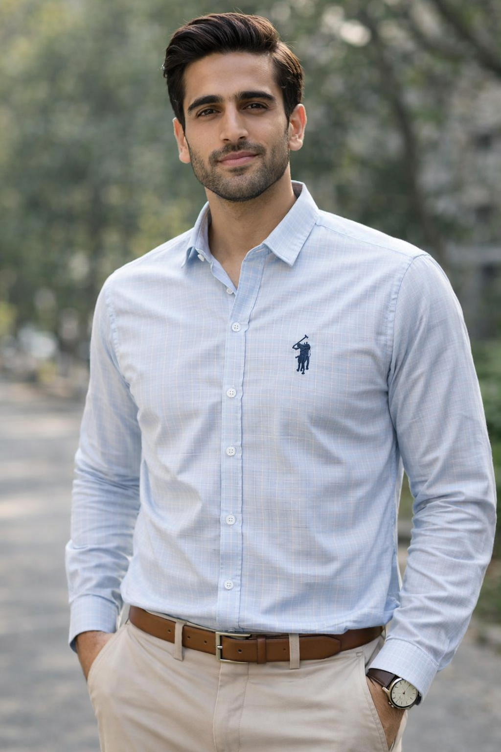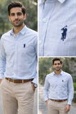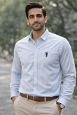 The shirt features a fine textured weave with a subtle check pattern and a minimal embroidered logo on the chest, adding a touch of elegance without being loud. Its tailored regular fit ensures a sharp silhouette whether worn casually or for semi-formal occasions.
