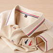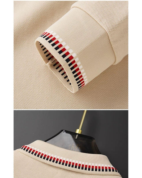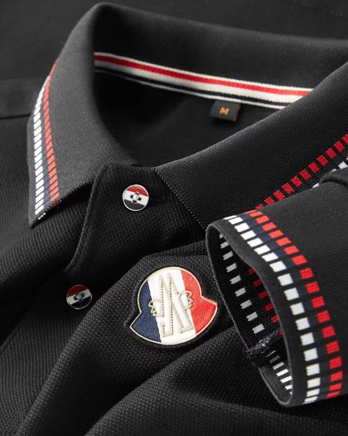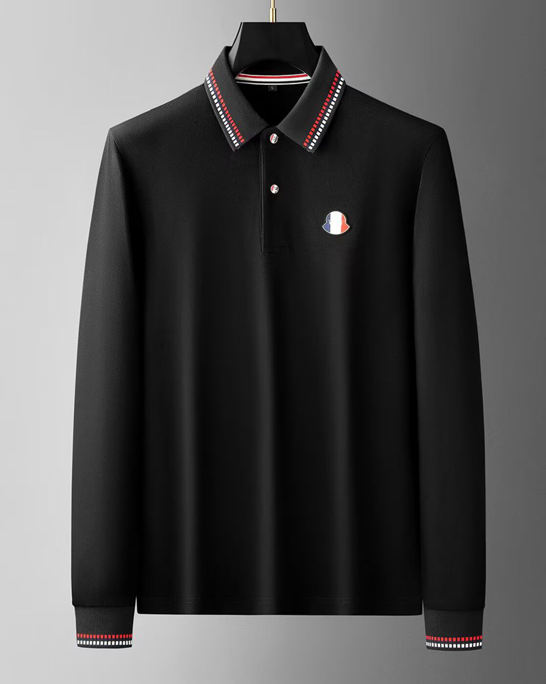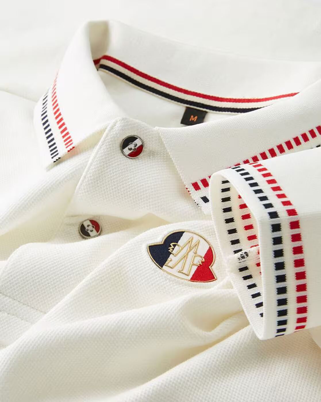 Dual-tone stripe detailing on collar and sleeves (navy and red)