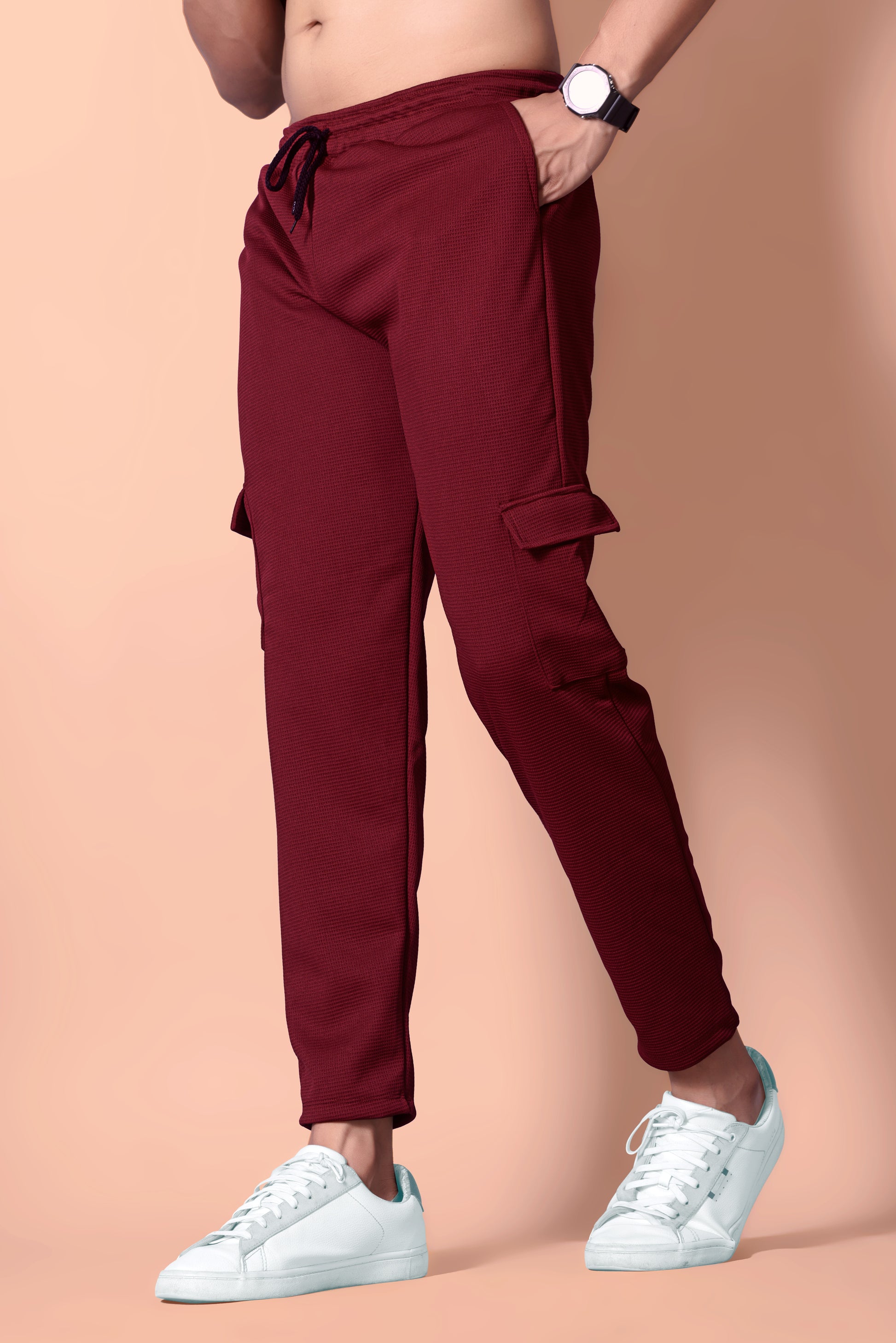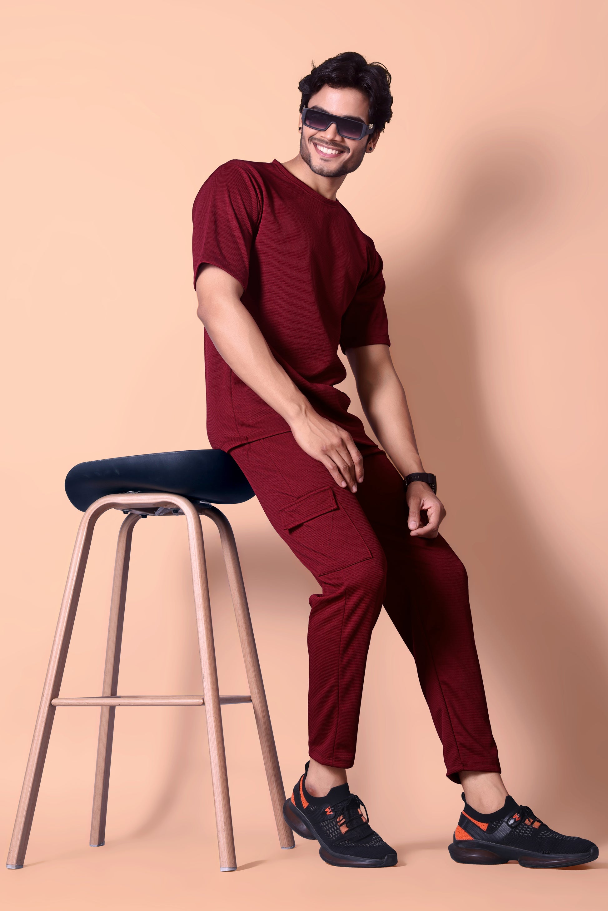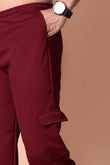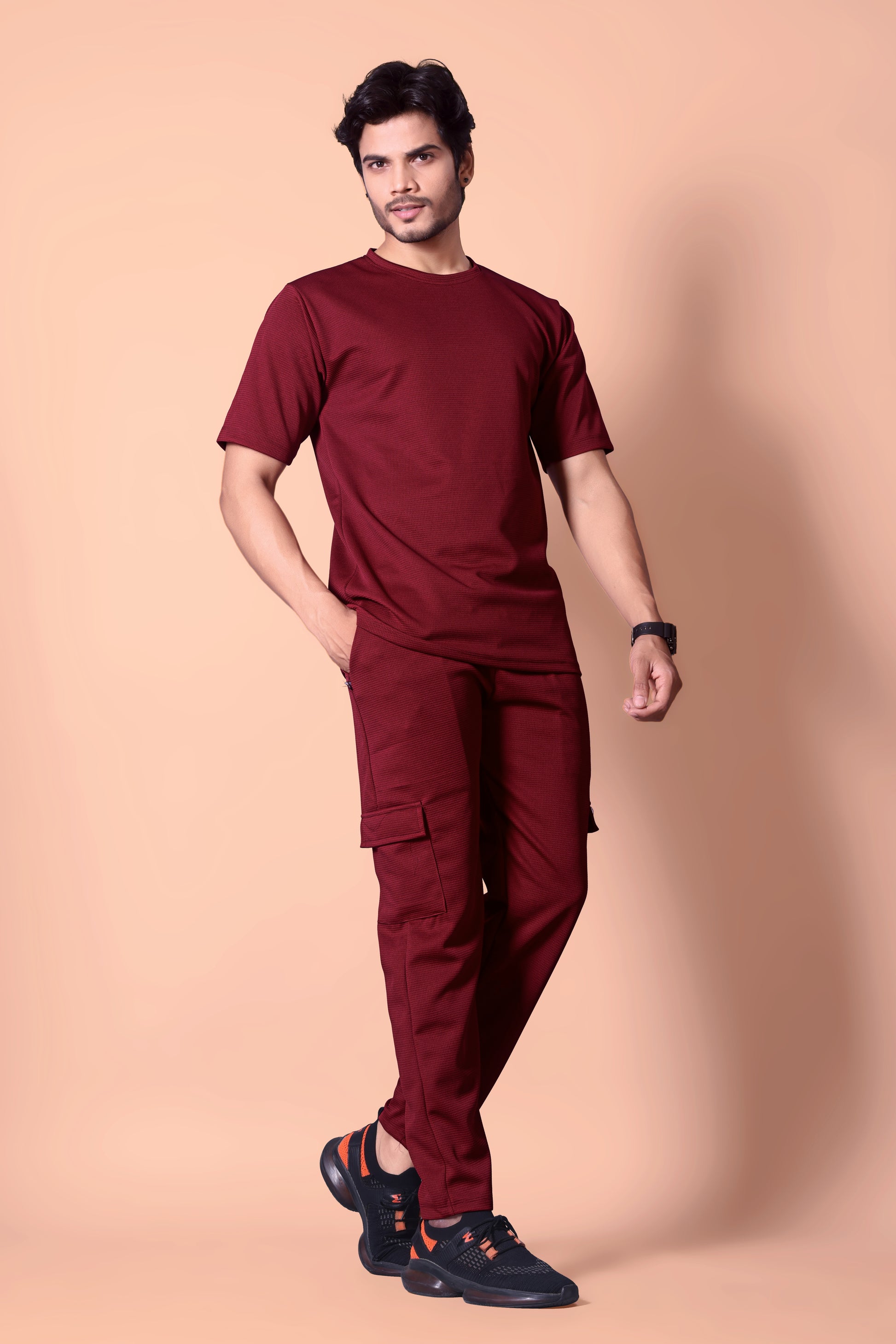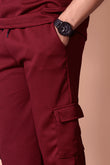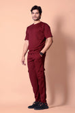 'Elevate your casual wardrobe with our Men's Maroon Co-ord Set. This stylish two-piece outfit features a modern color block t-shirt with a white textured panel, perfectly paired with matching Olive textured cargo joggers. The joggers are designed with practical cargo pockets and a comfortable fit, while the t-shirt offers a classic, crew-neck style. This set is your go-to for an effortlessly put-together look, whether you're relaxing at home or heading out for a casual day."